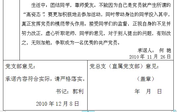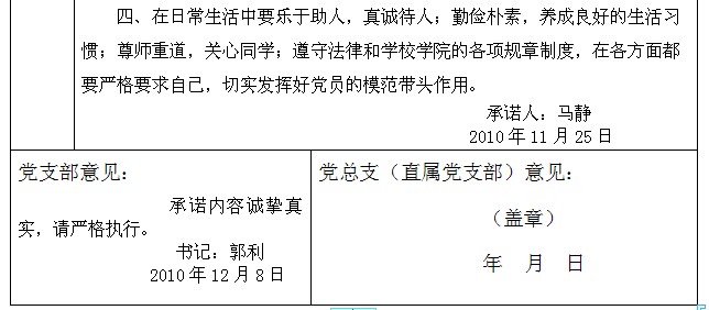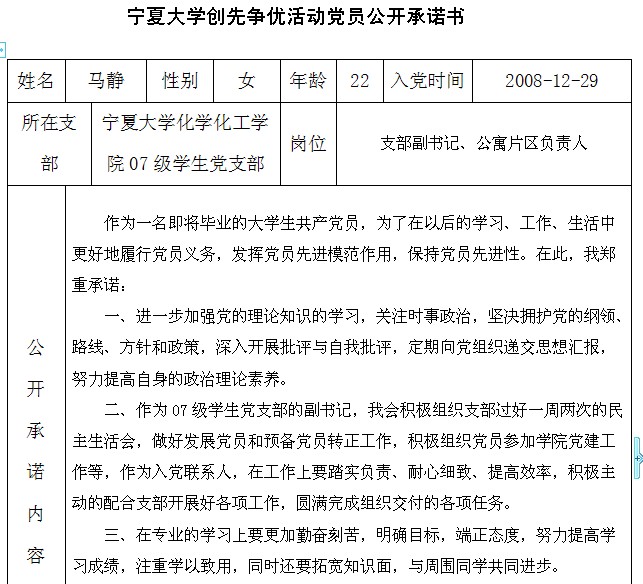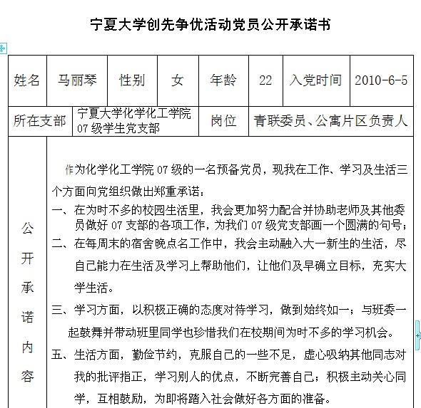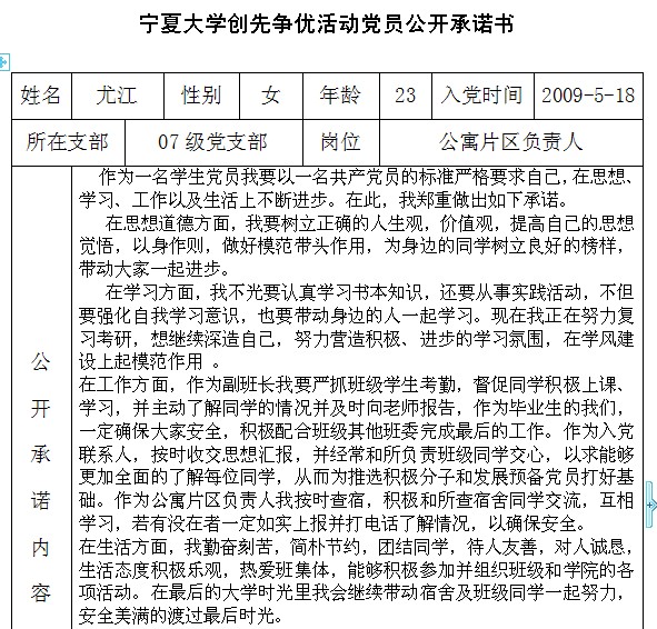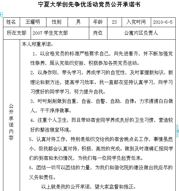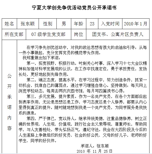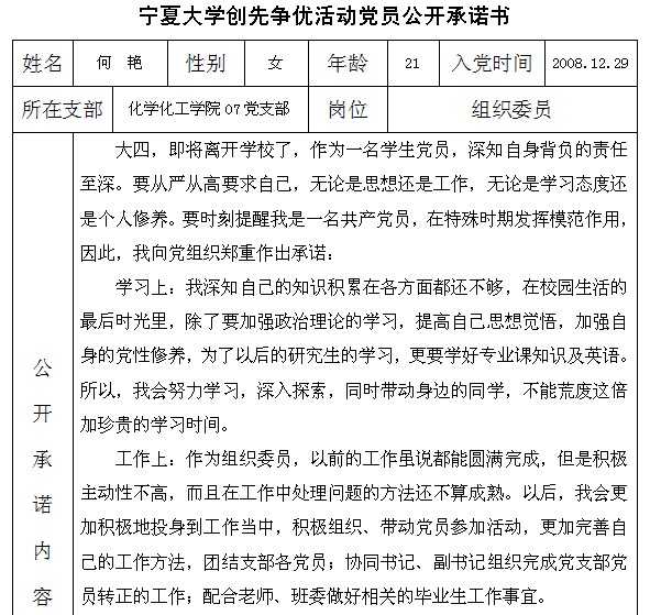 排列五 创先争优活动党员公开承诺书(2007级党支部)