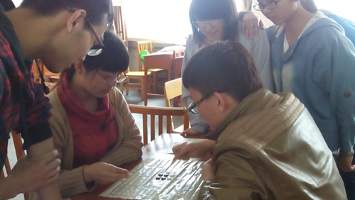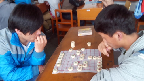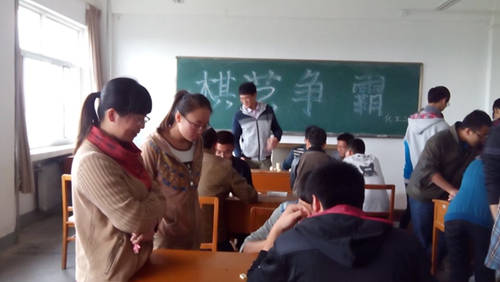 此次比赛项目有中国象棋,暗翻军棋和五子棋,比赛采用了淘汰制的方法,2013级辅导员老师王艳梅和同学们一起参与比赛。在整个比拼中,象棋赛区内对战双方马踏炮轰,兵来将挡,大有一番逐鹿中原之势;军旗赛区内对战双方各显神通,在最关键时刻力挽狂澜,化险为夷;五子棋赛区内你冲我截,亦是一番厮杀景象。经过近两个半小时的厮杀角逐,象棋赛区内,高正超一举夺冠,军旗与五子棋之冠由金建林、刘冰惠所得。