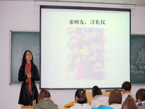 范辉老师充分发挥了自身课堂教学的特点,整场讲座活泼灵动,结合她制作的精美PPT一同讲解,范老师的魅力成功吸引了在场所有同学。她从自己层面的理解为大家解读道德这一概念,她引用《道德经》和《三字经》,强调了“守孝悌 次见闻”,通过小男孩与树的故事,化抽象为具体地讲述了父母的无悔付出与子女的不断索取,呼吁大家在前行时不要忘记回头关心背后目送我们远去的父母。随后,范辉老师对“亲师友 习礼仪”做了说明,告诉同学们应学会沟通,不断提升自己的修养。她还告诫大家:欲会做事,先会做人。最后范辉老师回忆了自己的大学生活,结合个人经历为大家提出了关于学习、生活、职业几方面的建议。