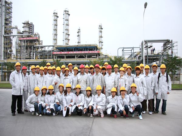 简短的座谈会后,场接待员工根据安全需要,分发了安全帽、工作服。大家穿戴整齐,在几位工人师傅带领下开始了参观活动。一进入厂区,高大的机械厂房,化工设备无不令人惊叹,一路上同学们围绕在工人师傅周围,认真听取他们的介绍。他们手指眼前的设备厂房向同学们介绍每个车间的工艺流程和他们的基本工作内容,每个环节都深深地吸引着同学们。