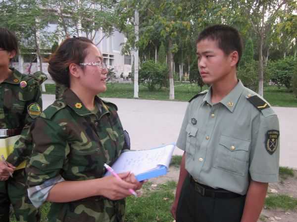 她,善解人意。拿军训来说,虽然宣传是我们的工作,但她体谅大家对军训百分百的热情,只要我们愿意,能参训就让大家参训,而非纯粹为工作而工作。我曾以为被安排进宣传组就会失去这人生中最后一次军训机会,真的会遗憾万分,可是,我没有,我既可以体验累并快乐着的军训,又可以用文字来尽情抒写自己的感触。她还带领我们去跟大家一起学军歌,畅享军歌的豪迈雄浑,感悟训练之余的激情飞扬。谢谢你,班长!