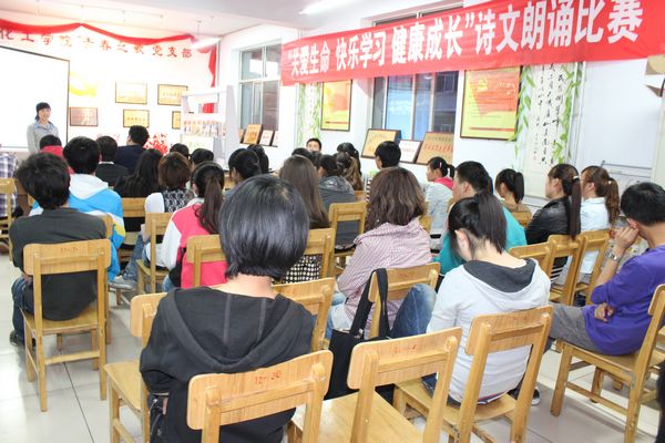 分团委主办的“关爱生命,快乐学习,健康成长”主题诗文朗诵大赛决赛在12#楼公寓党员活动室举行。