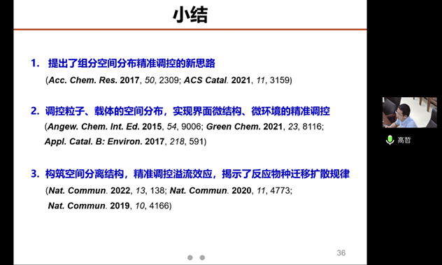 高哲研究员以“多组分催化剂的精准构建”为题作了报告,提出了组分空间分布精准调控的新思路,通过调控粒子、载体的空间分布,实现界面微结构、微环境的精准调控;构筑空间分离结构,精准调控溢流效应,揭示了反应物种迁移扩散规律。