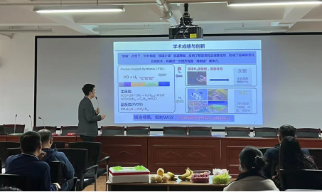 随后,高新华博士以“Fe基催化剂表面浸润性对费托合成产物分布调控研究”为题进行了汇报,同时提出了未来研究设想。与会青年老师进行了热烈讨论和交流。
