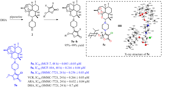 该研究首次通过一锅煮的方法高效制备了一系列新型青蒿素-哌嗪-呋喃醚杂化物5a-h,通过抗癌活性测试发现其对人肝癌细胞SMMC-7721和人乳腺癌细胞MCF-7具有很好的抑制活性,而对人乳腺良性细胞MCF-10A的毒性较低。优于目前使用的一线抗癌药物阿糖胞苷(ARA),在抗癌药物研发中具有潜在的应用价值。