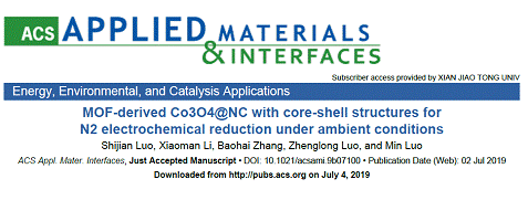 (省部共建煤炭高效利用与绿色化工国家重点实验室)罗民教授负责的能源和环境材料研究团队,在电催化固氮研究方面取得新进展。研究成果在线发表在美国ACS数据库国际著名学术期刊《ACS applied materials & interface》(Impact Factor 2018: 8.456)。论文题目:“MOF-derived Co3O4@NC with core-shell structures for N2 electrochemical reduction under ambient conditions”;DOI:10.1021/acsami.9b07100.排列五