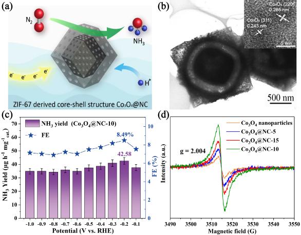 图1: (a) 核壳结构Co3O4@NC用于电化学氮气还原;(b) Co3O4@NC电催化剂的透射电子显微镜照片;(c) Co3O4@NC电催化剂的固氮性能;(d) Co3O4@NC电催化剂中氧空位活性位点含量分析。