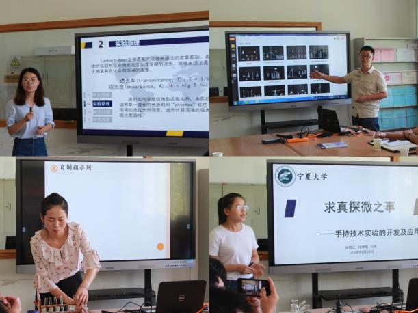交流结束后,倪刚院长又邀请名师班的老师来到吴晓红名师工作室,对化学教育专业的发展历程进行了简单的介绍,吴教授又安排团队学生依次展示了:“智能手机在化学实验中的应用设计与实践研究”“NB虚拟仿真软件介绍及案例解读”“利用黑枸杞自制酸碱指示剂”“求真探微之事――手持技术实验的开发及应用”等化学实验。异彩纷呈的现代教学手段激起了在座老师极大的兴趣,纷纷感叹教育技术在化学教学实验改革中发挥的巨大作用。活动的最后,吴教授热情的将学科组编写的《化学师范生项目化学习的设计与实践》和《中学化学可视化教学设计与案例》丛书送给名师班的老师。