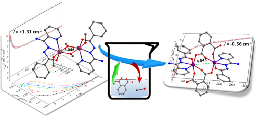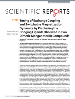 刘翔宇副教授、宋伟明教授合作开展的金属Mn(III)配合物分子磁体的设计合成、结构及性能调控研究工作最近取得了新进展。由于在高密度存储材料、分子开关等领域具有良好的应用前景,配合物分子磁体是近年的研究热点之一。研究团队通过简单的化学过程实现了两例金属Mn(III)二聚物中桥连配体的替换,导致金属离子间的磁交换作用和体系整体的动态磁行为呈现了颠覆性的转换,具备成为分子开关的潜质。