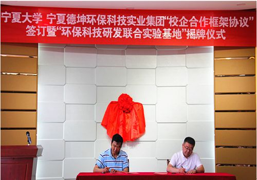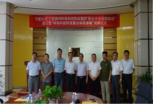 与宁夏德坤环保实业集团“校企合作框架协议”签字暨“环保科技研发联合实验基地”揭牌仪式在宁夏德坤环保集团多功能厅举行。自治区国资委企业改革发展处卢星亮处长、自治区环保厅科技标准处杨发奎处长、排列五