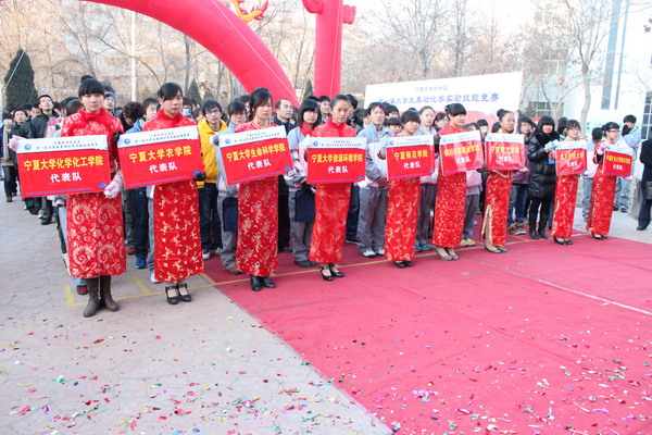 承办的“宁夏首届大学生基础化学实验技能大赛”在北校区排列五