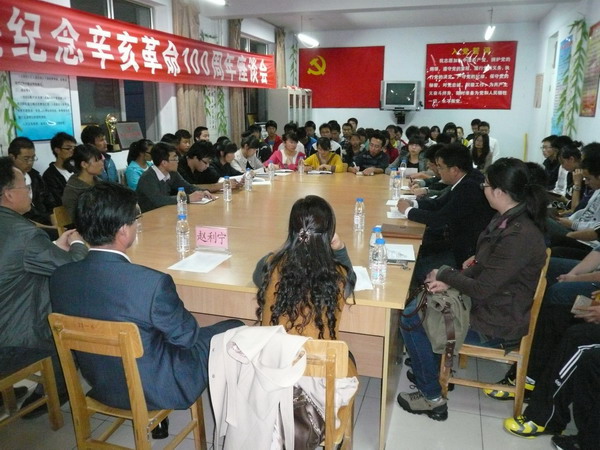 学生党员纪念辛亥革命100周年座谈会”。校党委副书记赵利宁、学生党建办主任沈岩东受邀出席了座谈会,化工学院各学生党支部党员、院学生会和分团委干部代表80人参加了座谈会,排列五