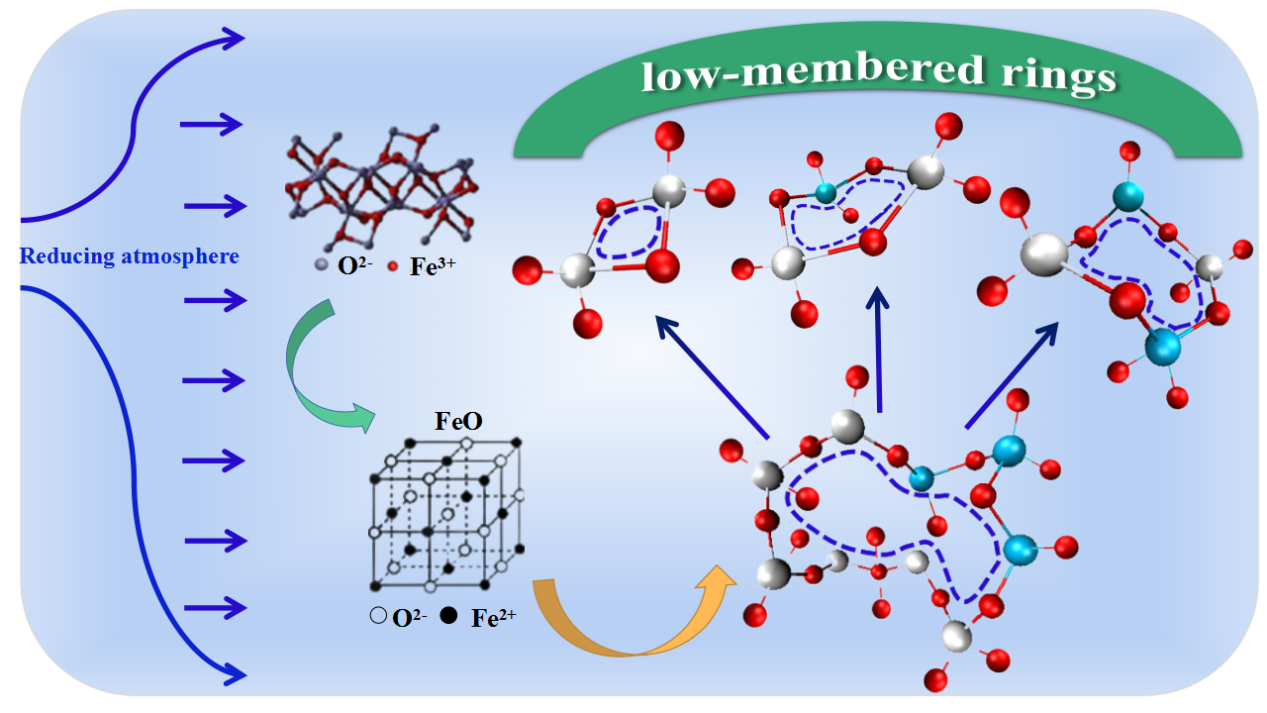 熔渣的流动性是影响工业气化炉稳定运行的重要参数。该项成果基于模拟计算和实验方法从熔渣中程结构角度出发探究了铁元素对煤灰渣流动行为的影响。在熔渣微观结构中,[SiO4]4-和[AlO4]5-四面体阴离子基团通过氧原子相互连接形成具有高聚合度的多元环,主要分布于14-18元环。在复杂的多元环结构的影响下,内摩擦力增加,熔渣在宏观上表现出较大的粘度。在弱还原气氛下,作为网络修正离子的Fe2+可以取代多元环中的Si4+和Al3+并与O2-结合,这将导致大量高聚合度的多元环结构被不断解聚为聚合度低的低元环结构,主要分布于4-8元环。这一结果简化了熔渣结构,降低了内摩擦力,并改善了熔渣流动性。最后,定义了环分布系数(Rdc)并与熔渣的流动行为建立了一定的关系。该研究工作旨在从中程结构演变角度揭示熔渣的流动机理,为工业气化炉的稳定排渣和高效气化提供理论依据。
