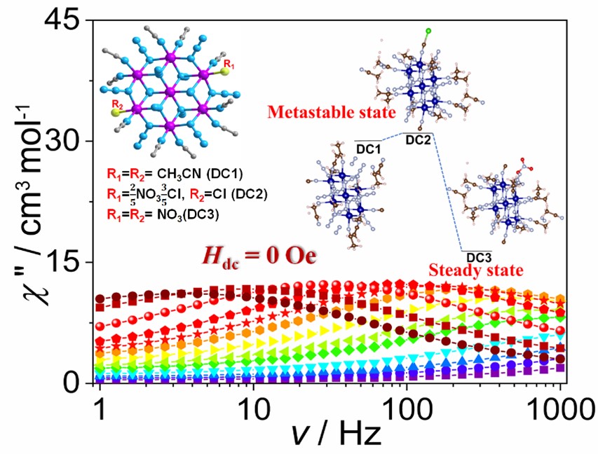 单分子磁体是一类重要的分子磁性材料,在高密度信息存储、量子计算和自旋电子学方面具有重要的应用前景。理论上,大的基态自旋(S)和强的磁各向异性(D)是获得高性能分子磁性材料的重要考量,实现二者的正向协同效应面临较大挑战。前期研究表明,Co(Ⅱ)具有强的磁各向异性,通过桥连配体构筑多核Co(Ⅱ)金属簇有望同时获得强的磁各向异性和大的基态自旋。基于以上,研究团队设计合成了三例叠氮单桥配位的盘式七核Co(Ⅱ)金属簇。通过微调反应条件实现了三例配合物间的结构转变,结合理论计算揭示了配合物的结构演化过程及其在热力学上所处状态的不同。磁性研究表明,三例配合物在无外加磁场的情况下呈现了慢磁弛豫行为,这是首次在七核Co(II)金属簇化合物中观察到零场单分子磁体行为。研究工作为高性能多核过渡金属分子磁性材料的设计合成和结构调控提供了思路。