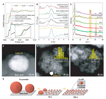 图:甲醇气氛诱导的大块铜表面原子向沸石分子筛表面迁移、分散的过程。