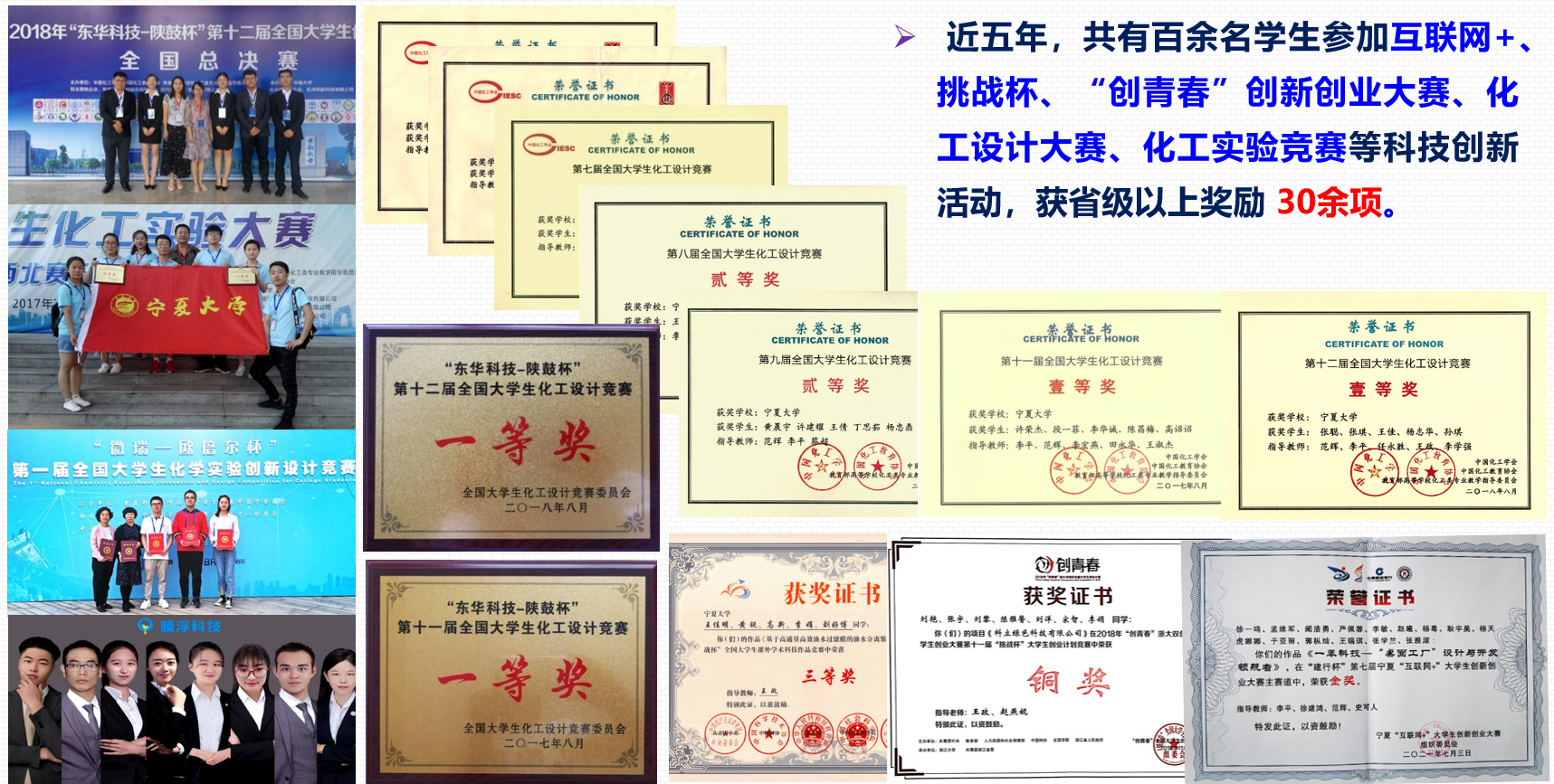 的培养下,学生们不仅在学术上取得了优异的成绩,而且在实践能力和创新精神方面也有着突出的表现。他们不仅在各类学科竞赛中屡获佳绩,而且在就业市场上也备受青睐。学院还注重学生的全面发展,通过举办各类文化活动和社团活动,丰富学生的课余生活,提升他们的综合素质。近五年获第八届中国国际“互联网+”大学生创新创业大赛总决赛高教赛道金奖1项,中国“互联网+”创新创业大赛全国金奖、银奖、铜奖各1项,获得全国大学生化工设计竞赛全国一等奖、二等奖、三等奖25项,获得全国大学生化工实验大赛全国二等奖4项,获得全国大学生金相技能大赛一等奖3项,获得全国“互联网+化学反应工程”课模设计大赛,二等奖、三等奖4项。