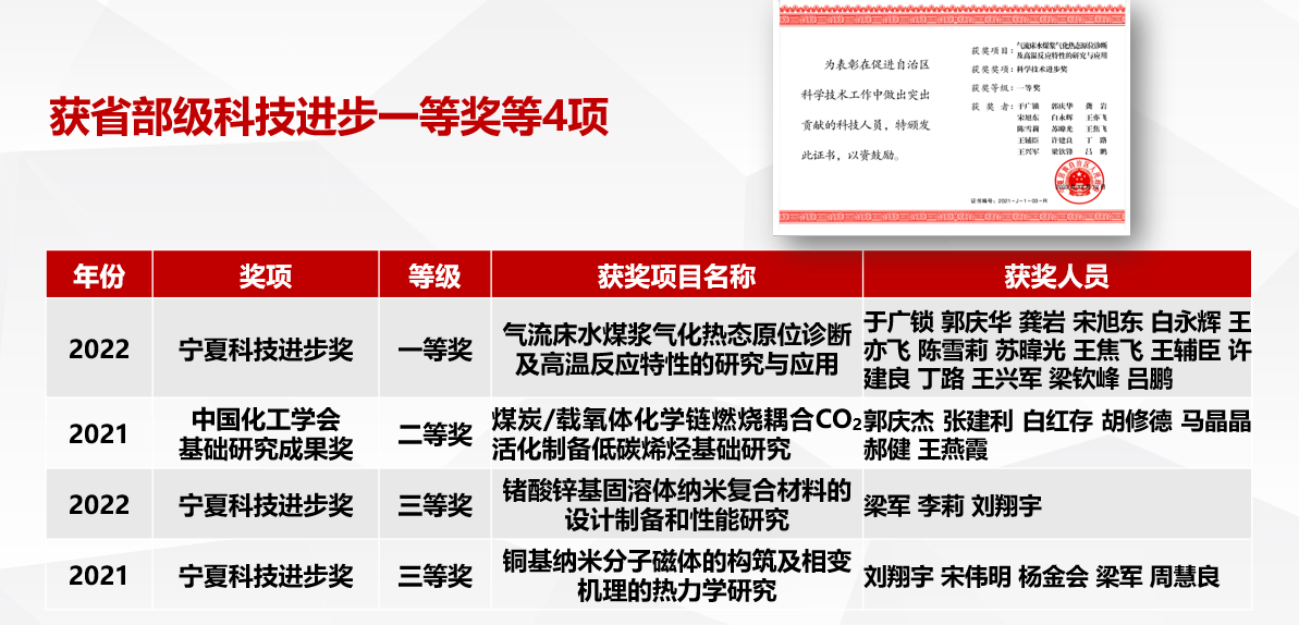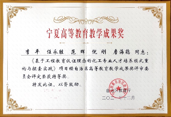 化学工程与工艺虚拟教研室获批教育部虚拟教研室建设点,专业建设成果获2021年获自治区高等教育教学成果奖特等奖1项、二等奖1项。
