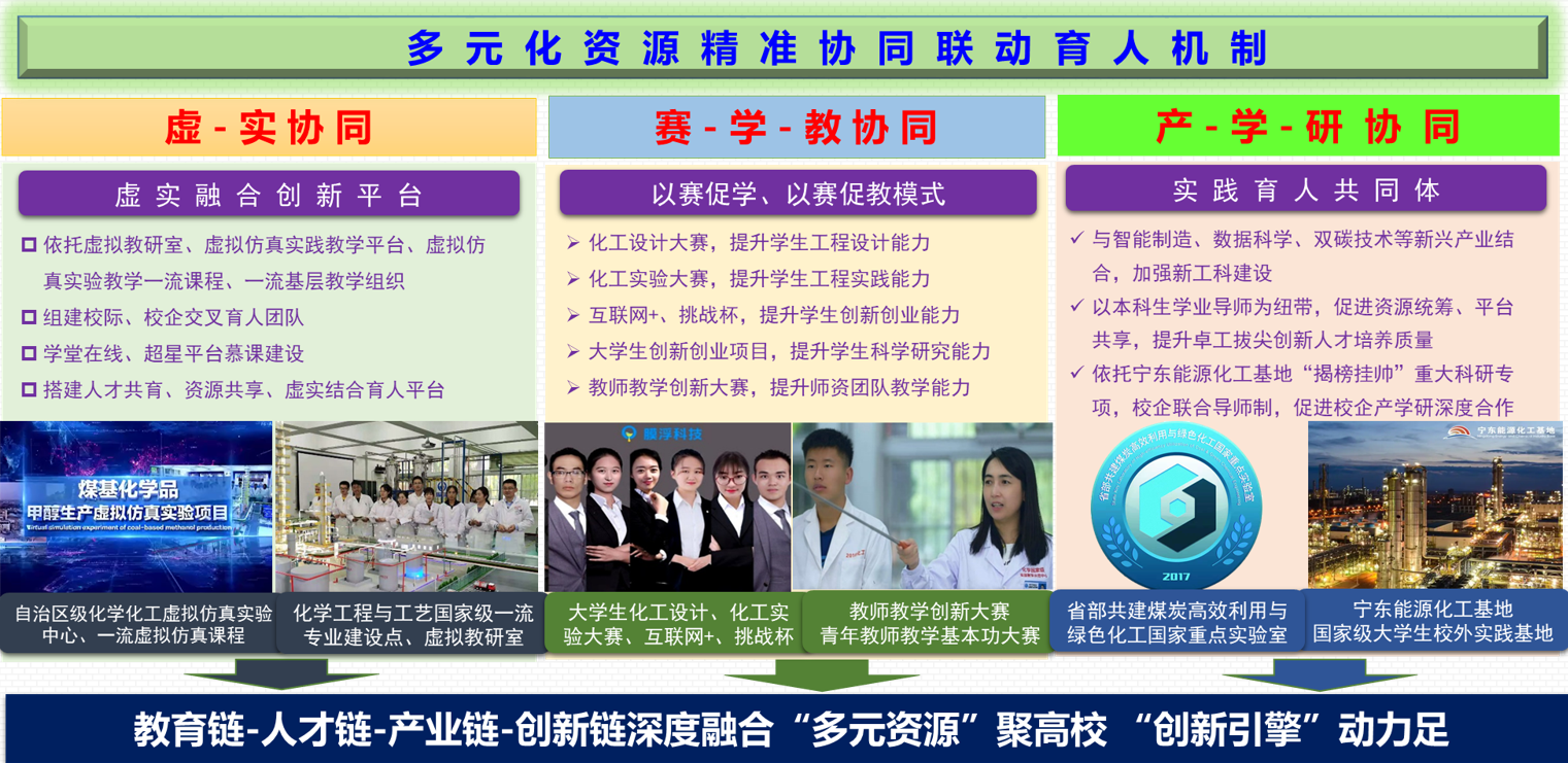 学院拥有化学国家级基础实验教学示范中心、宁夏天然药物工程技术研究中心等各类基础、专业、综合、学生创新和科研实验国家级自治区级化学化工虚拟仿真中心,与宁夏化学化工虚拟仿真实验教学中心、宁夏回族自治区级化学化工类大学生职业技能培训基地、虚拟仿真一流课程,在实践教学中虚实结合,依托国家级虚拟教研室、自治区级一流基层教学组织,促进教学资源数字化建设与网络教学资源平台建设,创新教育教学方法,搭建人才共育、资源共享、虚实融合的多维度虚实协同育人机制,创新竞进,在协同和发展上补动力。