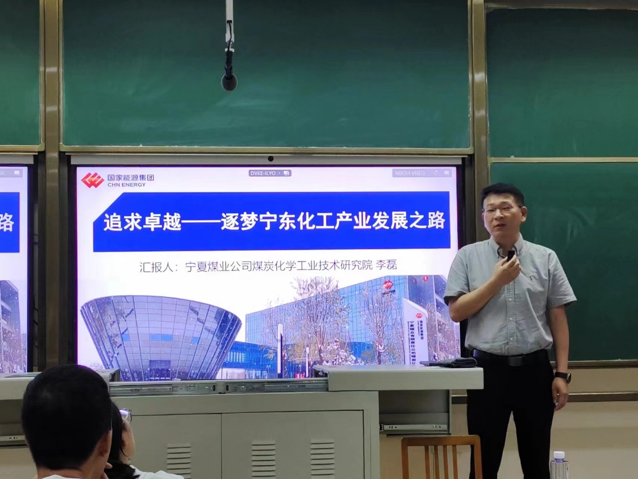 李磊副院长通过播放宁煤的宣传片首先为同学们介绍了宁煤集团的产业构成与发展历程,然后以幽默风趣的方式给同学们分享了自己入职宁煤后的成长之路。他给同学们介绍了主持和参与“国产主催化剂在煤基均聚聚丙烯Novolen工艺上的研究应用”、“煤基清洁聚丙烯催化技术研究”、“新型聚丙烯Ziegler-Natta催化剂的制备和工业化应用研究”及“以费托蜡为原料生产高档润滑油技术与装备”等项目实施过程中发生的一些故事,使同学们深入了解了宁东产业发展过程中在国产催化剂替代、国产化关键技术研发方面所走过的艰难历程和工程技术人员的拼搏奋进。