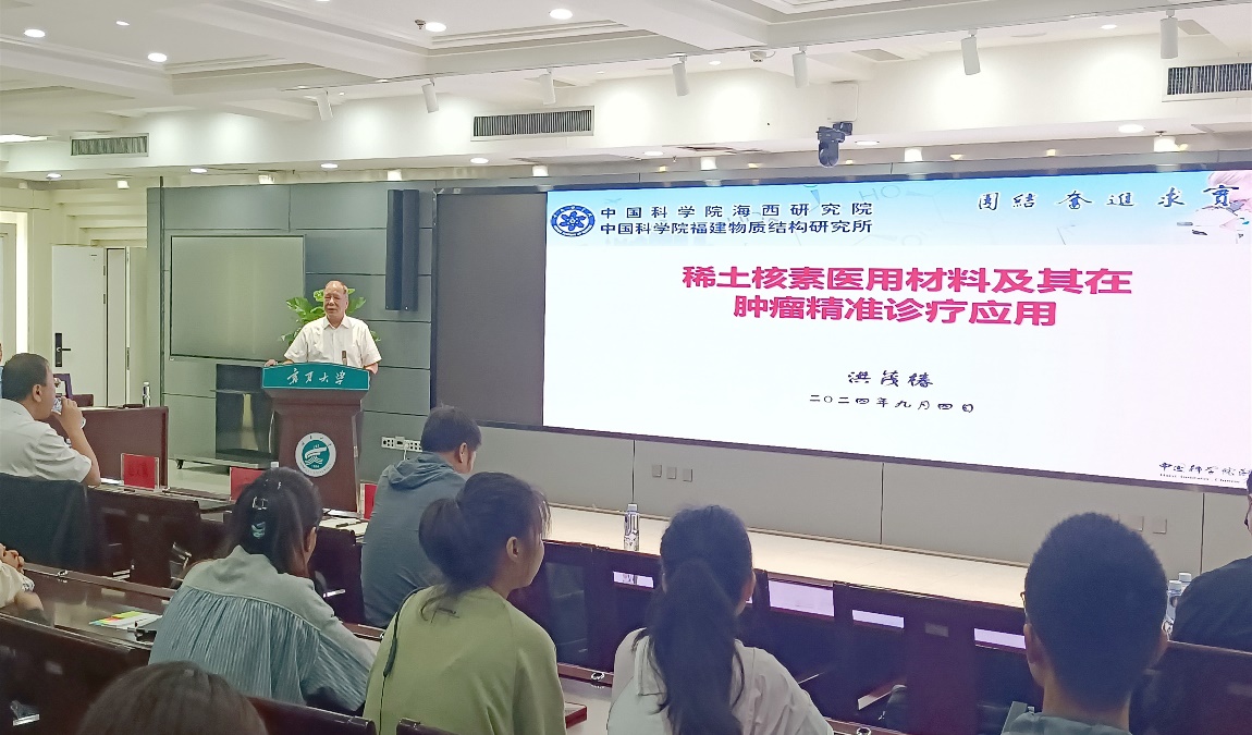 2024年“知化论坛”学术大讲堂系列报告活动在贺兰山校区德勤楼六楼会议室成功举行。中科院福建物构所洪茂椿院士以“稀土核素医用材料及其在肿瘤精准诊疗中的应用”为题做了学术报告,张鹏飞教授主持本次报告会。
