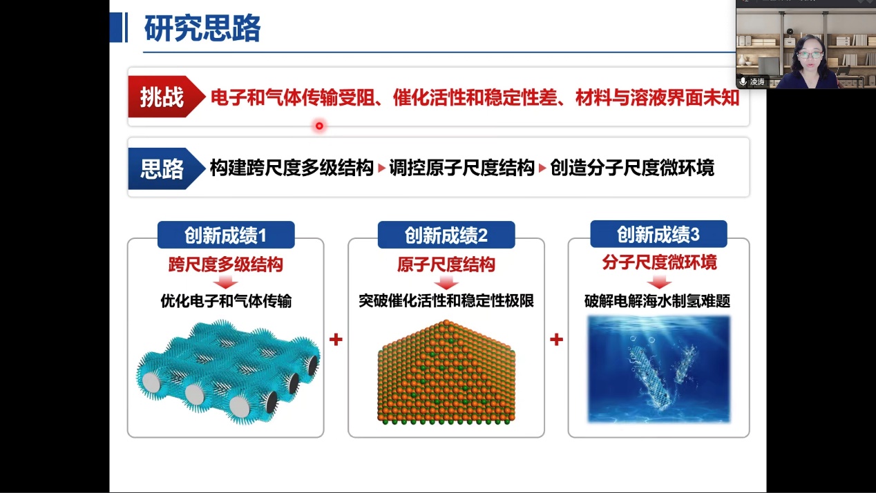 凌涛教授以“电催化材料”为题,详细分析了电催化制氢体系存在的技术难题,从“电子和气体传输受阻”、“催化活性和稳定性差”和“材料与溶液界面未知”的角度出发,提出了通过构建跨尺度多级结构和调控原子尺度结构,以及创造分子尺度微环境的解决策略,为电解水/海水制氢的理论设计和技术应用提供了借鉴。