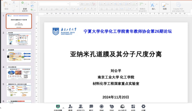 刘公平教授以“亚纳米孔道膜及其分子尺度分离”为题,重点讲述了其团队在新型亚纳米孔道膜构筑方面的研究进展,并介绍了新型亚纳米孔道膜材料的规模化制备以及工程应用的相关工作。