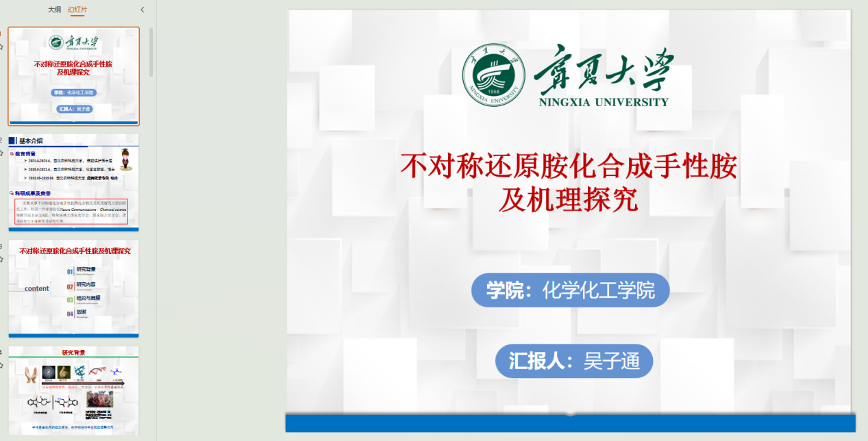 随后,吴子通博士以“不对称还原胺化合成手性胺及机制研究”为题,针对不对称还原胺化过程一级和二级胺为胺源手性不易控制的问题,围绕手性亚磷酰胺配体的空间位阻和电子效应进行了探究,合成了手性仲胺和叔胺,为手性胺类药物的合成提供了新思路。
