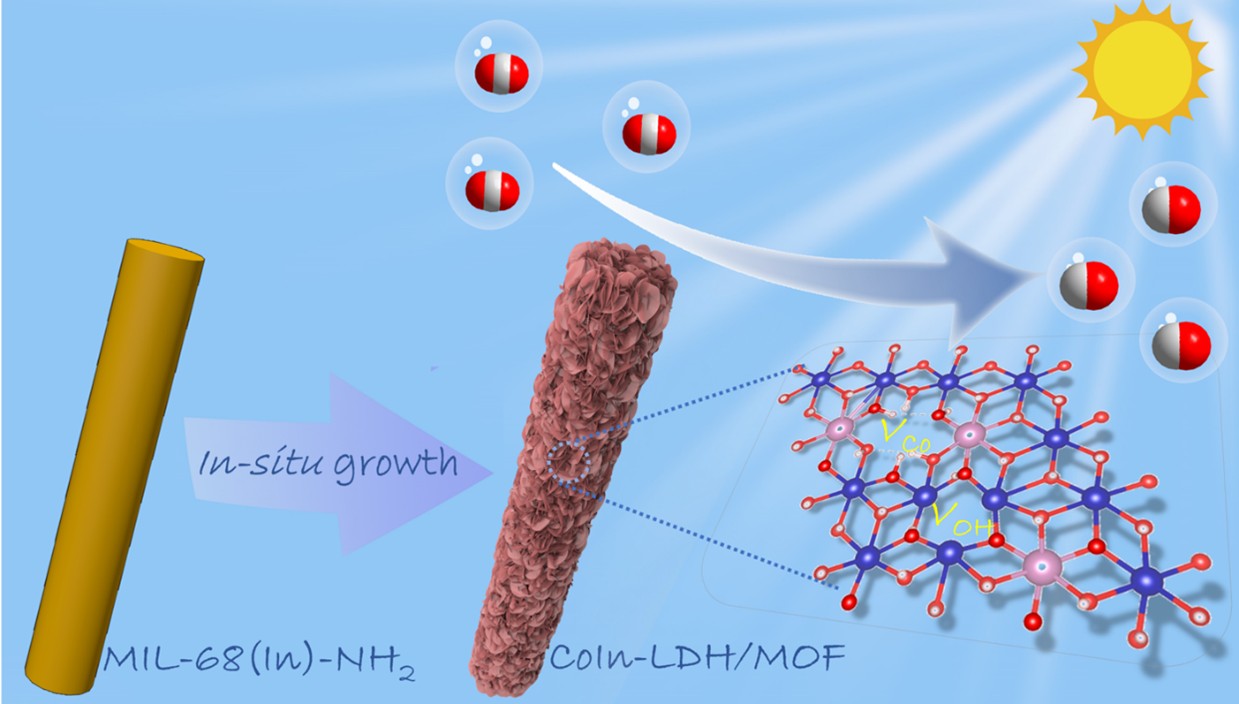 本项工作以MIL-68(In)-NH2为模板原位生长具有超薄纳米片形貌的双金属氢氧化物CoIn-LDH/MOF。CoIn-LDH/MOF光催化CO2还原为CO的产量达到2.32 mmol·g-1·h-1,远高于MIL-68(In)-NH2和块状CoIn-LDH的光催化性能。通过同步辐射、原位XPS、原位漫反射傅里叶变换红外光谱等一系列表征和理论计算对其机理进行了深入分析,证明CoIn-LDH/MOF中金属和羟基双空位的存在促进了电子转移,降低了产生*COOH和CO(g)的能垒,从而提高了光催化CO2还原性能。本工作为合成富含缺陷的光催化材料提供了新思路。