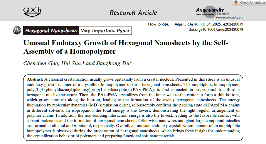 孙辉博士在高分子自组装研究领域取得进展。该工作以“UnusualEndotaxyGrowth of Hexagonal Nanosheets by the Self-Assembly of a Homopolymer”为题发表在国际顶级期刊《Angew. Chem. Int. Ed.》,并被选为Very Important Paper。该论文第一作者为硕士研究生高晨晨,孙辉博士为通讯作者,排列五