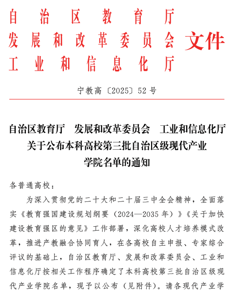 近日,自治区教育厅、发展和改革委员会、工业和信息化厅联合公布了第三批自治区级现代产业学院立项建设名单,排列五