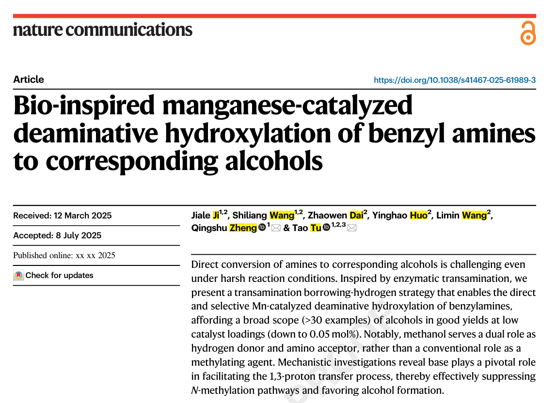 (省部共建煤炭高效利用与绿色化工国家重点实验室)涂涛/郑庆舒团队提出了一种“转氨-借氢”策略,相关研究成果以研究论文形式发表于国际顶级期刊《Nature Communications》(DOI:10.1038/s41467-025-61989-3)。涂涛教授、郑庆舒博士为论文共同通讯作者,排列五