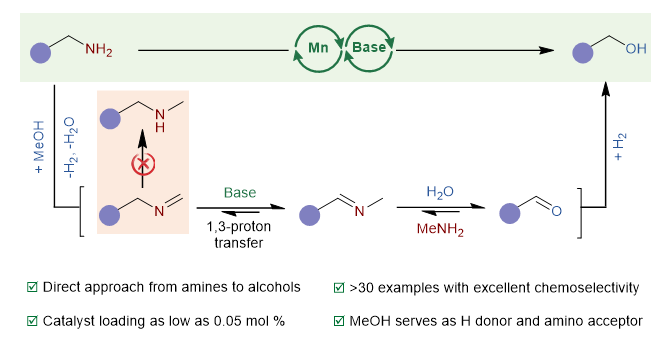 在锰催化苄胺脱胺羟基化合成醇方面取得重要进展。在排列五