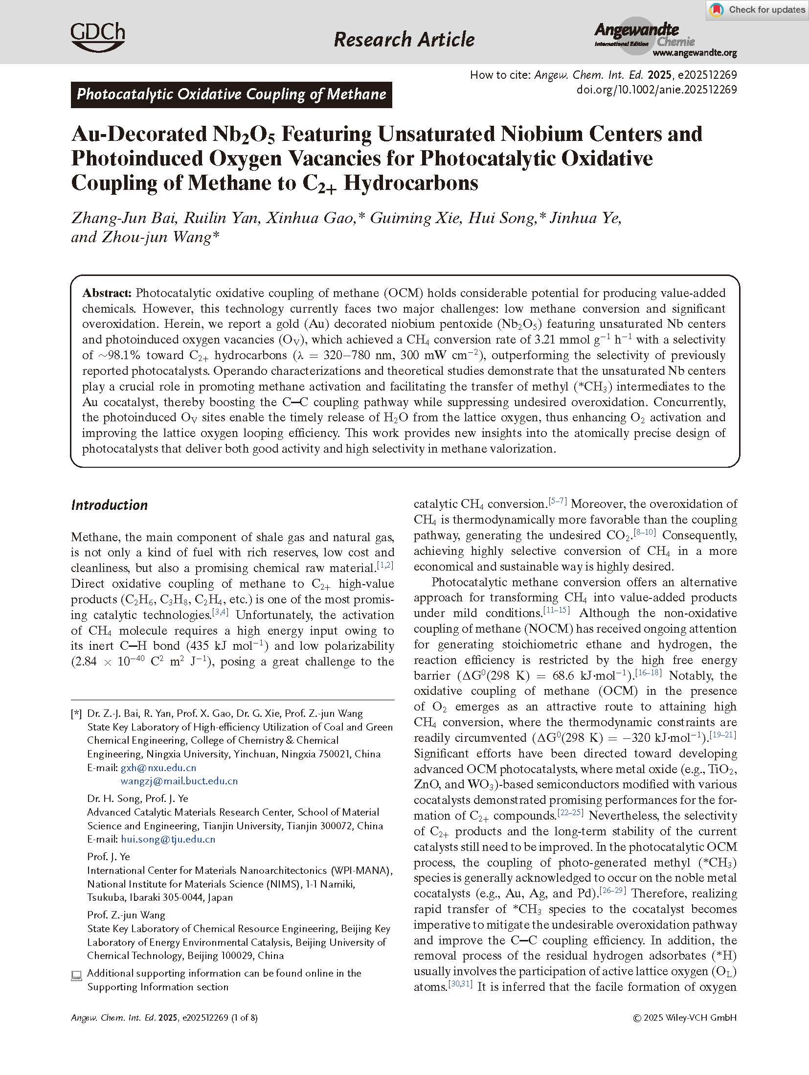 (省部共建煤炭高效利用与绿色化工国家重点实验室)王周君/白张君团队在甲烷催化转化方向取得系列进展。团队发现富含配位不饱和铌(Nb)位点和光生氧空位的Au/Nb2O5催化剂在甲烷氧化偶联制C2+反应中展现良好的活性、超高的选择性和优异的稳定性,相关研究成果发表于化学领域顶级期刊《Angewandte Chemie International Edition》(Doi.org/10.1002/anie.202512269)。白张君博士为论文第一作者,王周君教授、高新华研究员和天津大学宋辉副教授为论文共同通讯作者,排列五