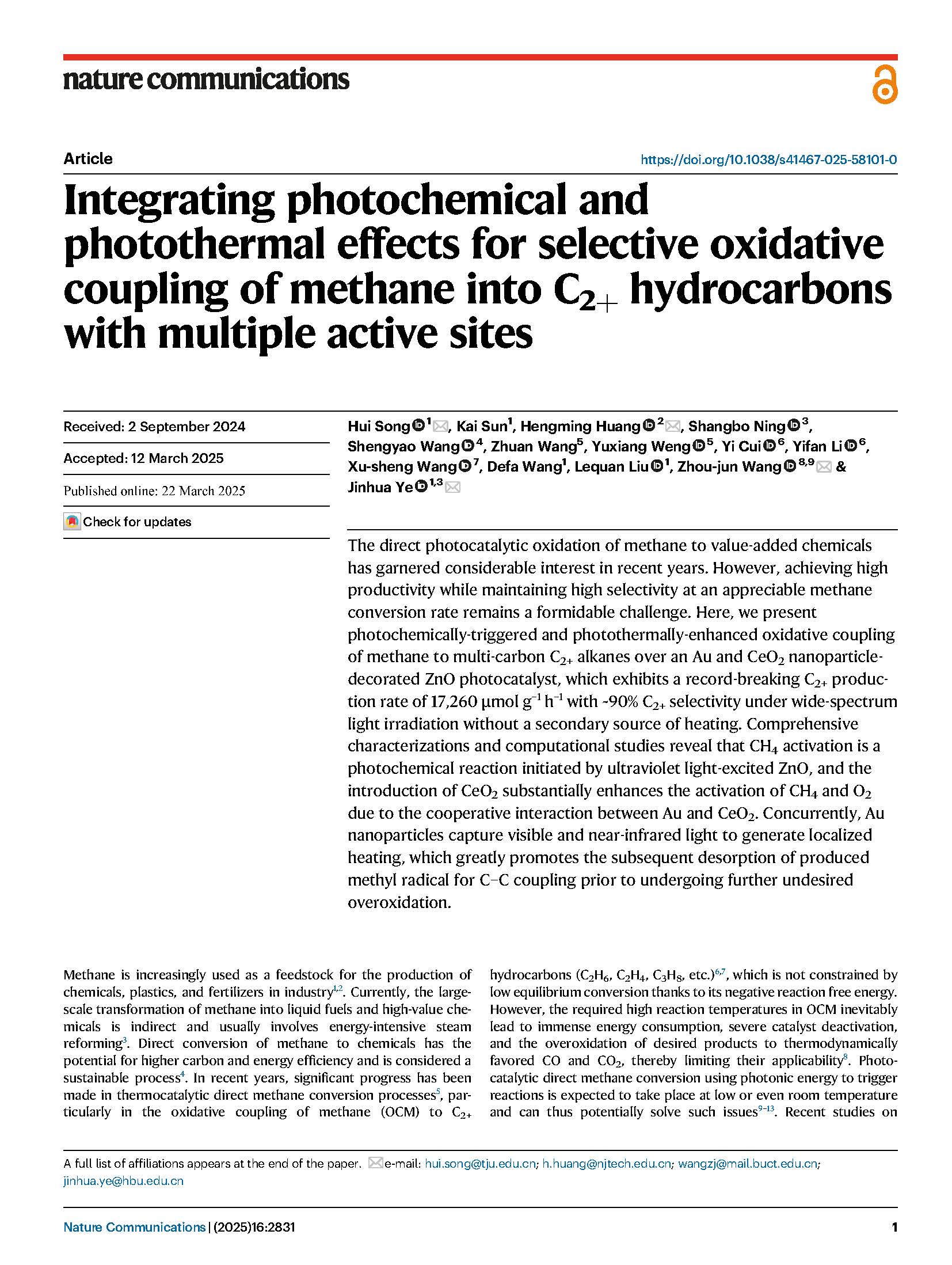 此前,王周君教授与天津大学叶金花教授/宋辉副教授团队合作,设计Au/CeO2/ZnO多活性位点催化剂,通过光催化触发和热效应增强的耦合协同策略,高活性高选择性地实现了甲烷氧化偶联制C2+产物,相关研究成果发表于国际顶级期刊《Nature Communications》(2025,16, 2831)。王周君教授为论文共同通讯作者,排列五
