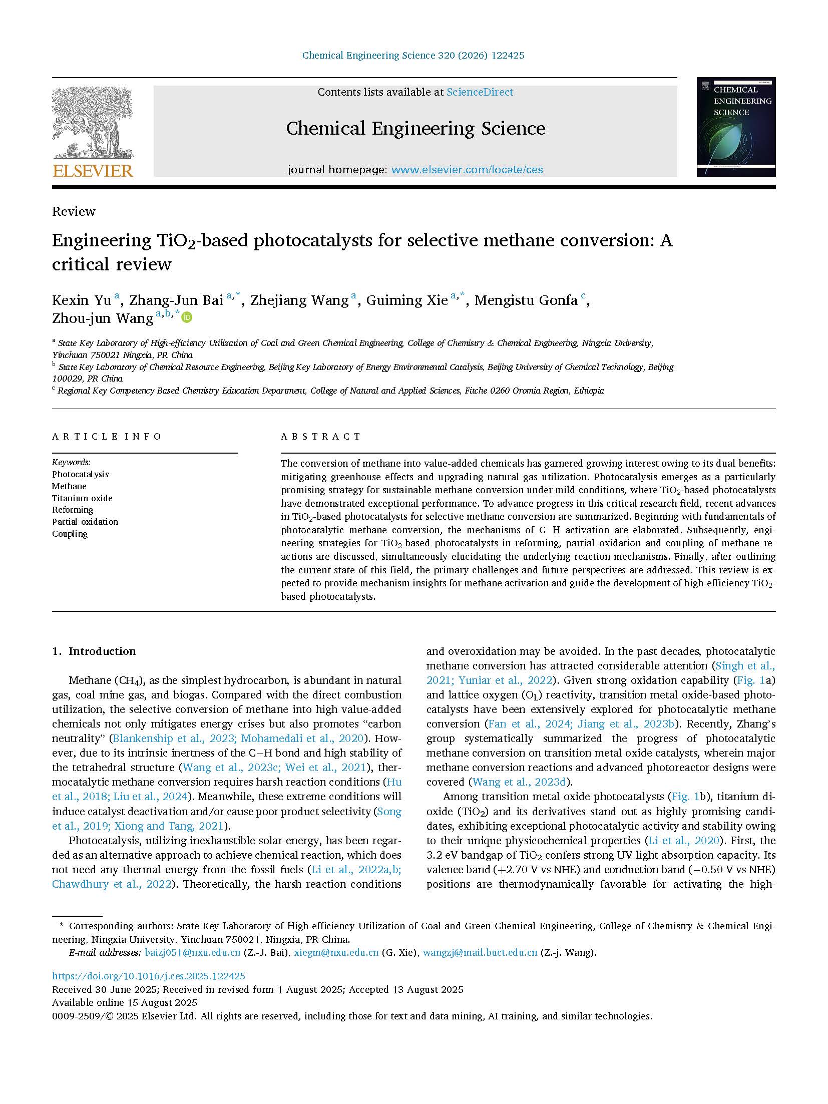 同时,王周君/白张君团队还对TiO2基甲烷光催化剂的结构设计策略及未来发展方向进行了系统总结,相关成果以综述论文形式发表于化工领域顶级期刊《Chemical Engineering Science》(2026,320, 122425)。硕士生于渴新为论文第一作者,王周君教授、白张君博士和谢贵明博士为论文共同通讯作者,排列五