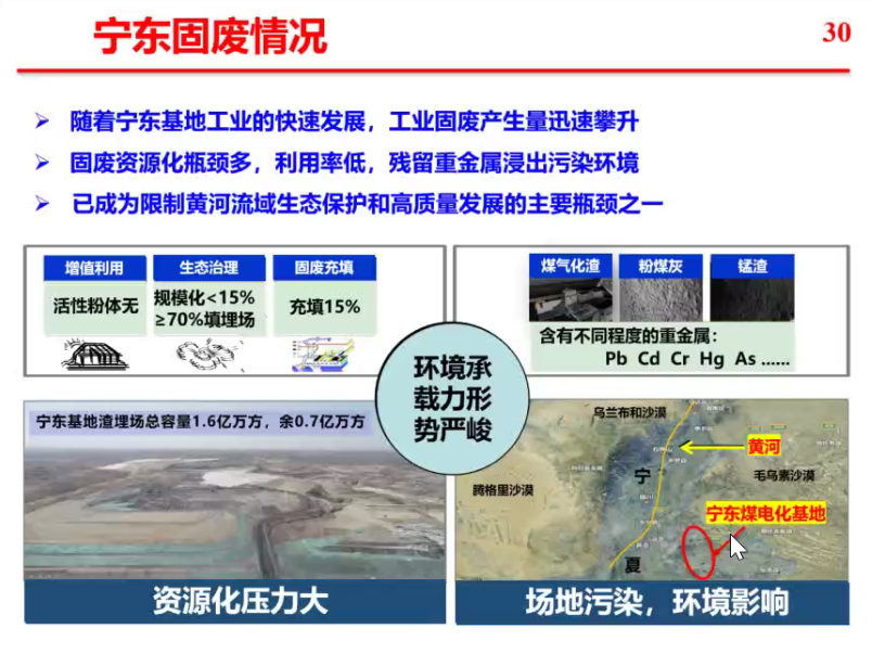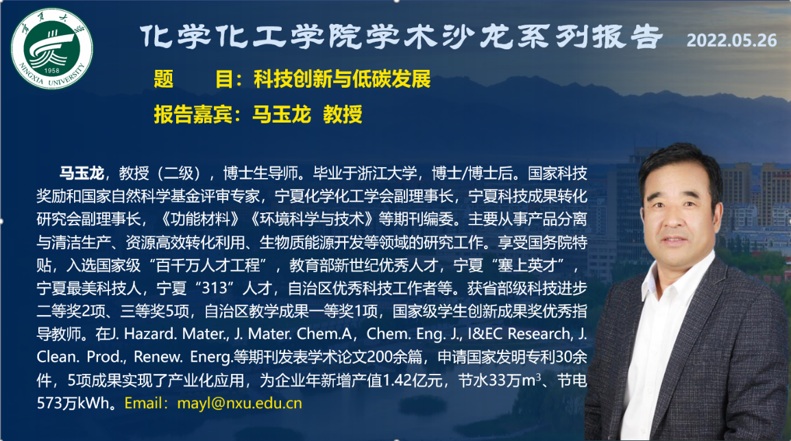 结合他本人多年的研究工作与研究成果,对可持续发展中的资源及环境问题、我国工业三废环境污染进行详细分析,并就当前发展面临的一系列挑战及应对的科技创新策略进行讲解,尤其对“双碳”背景下宁东地区产业发展所面临的废弃物处置问题进行分析。最后,马玉龙教授结合自己的研究体会,就低碳发展方式进行了探讨。