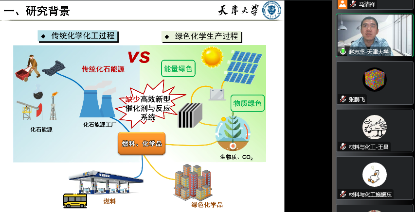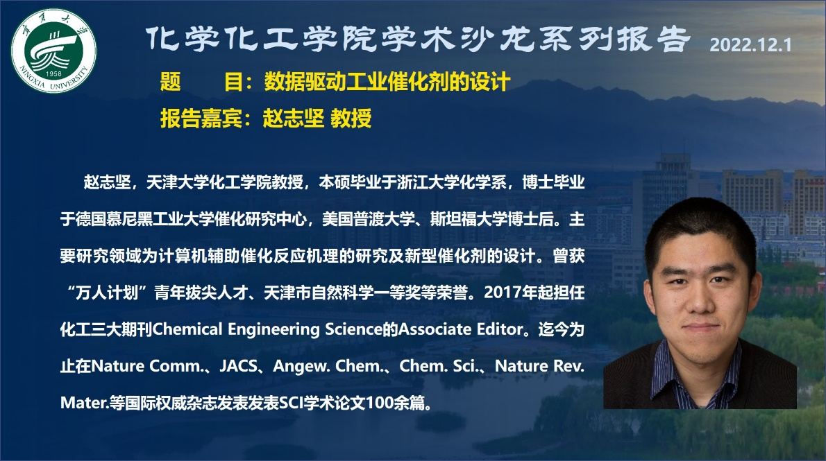 2022年秋季第十二次学术沙龙报告会在线上举行。天津市自然科学一等奖获得者,天津大学赵志坚教授做了题为“数据驱动工业催化剂的设计”的报告。学院部分青年教师及研究生、本科生近160人参加了此次学术活动。报告会由排列五