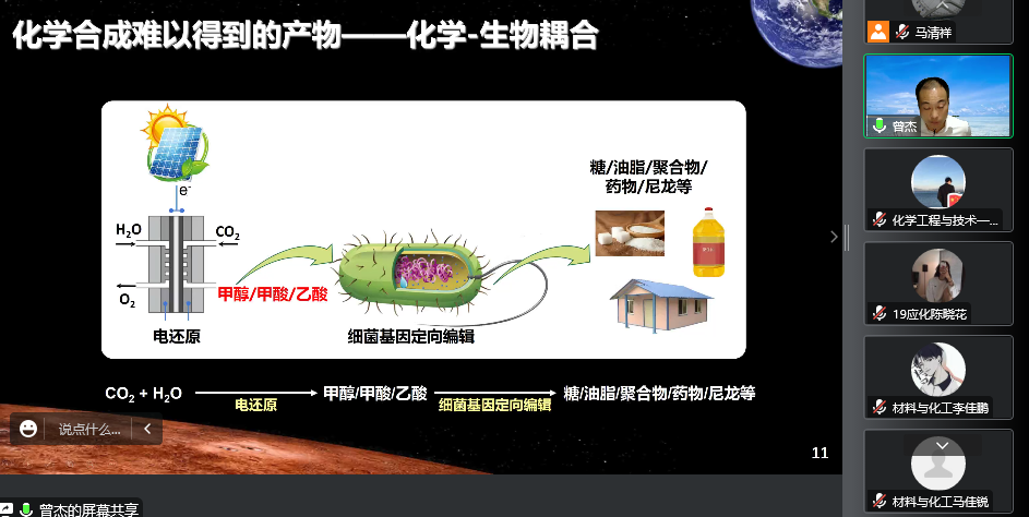 曾杰教授结合深空科学发展面临的呼吸、食物、药品及能源供应问题,通过构建系列催化剂并以电催化等手段,将二氧化碳和水转化成供在深空生存和发展所需要的燃料及化学品。报告结合详实的原位表征数据,分析了反应过程路径及作用机理。最后,曾杰教授详细回答了同学们感兴趣的问题。