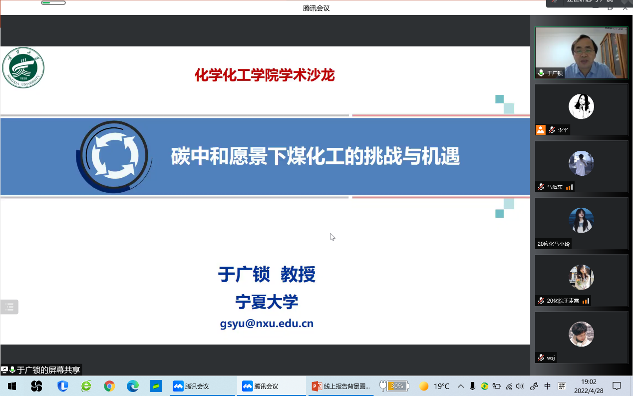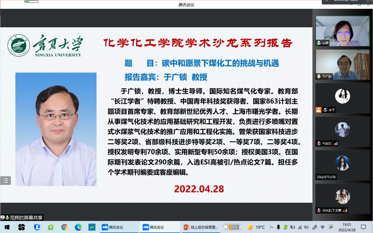 学术沙龙系列报告会在线上召开,中国青年科技奖获得者、国家863计划主题项目首席专家、上海市曙光学者于广锁教授做了题为“碳中和愿景下煤化工的挑战与机遇”的报告。学院部分老师、研究生、本科生参加了此次学术沙龙。