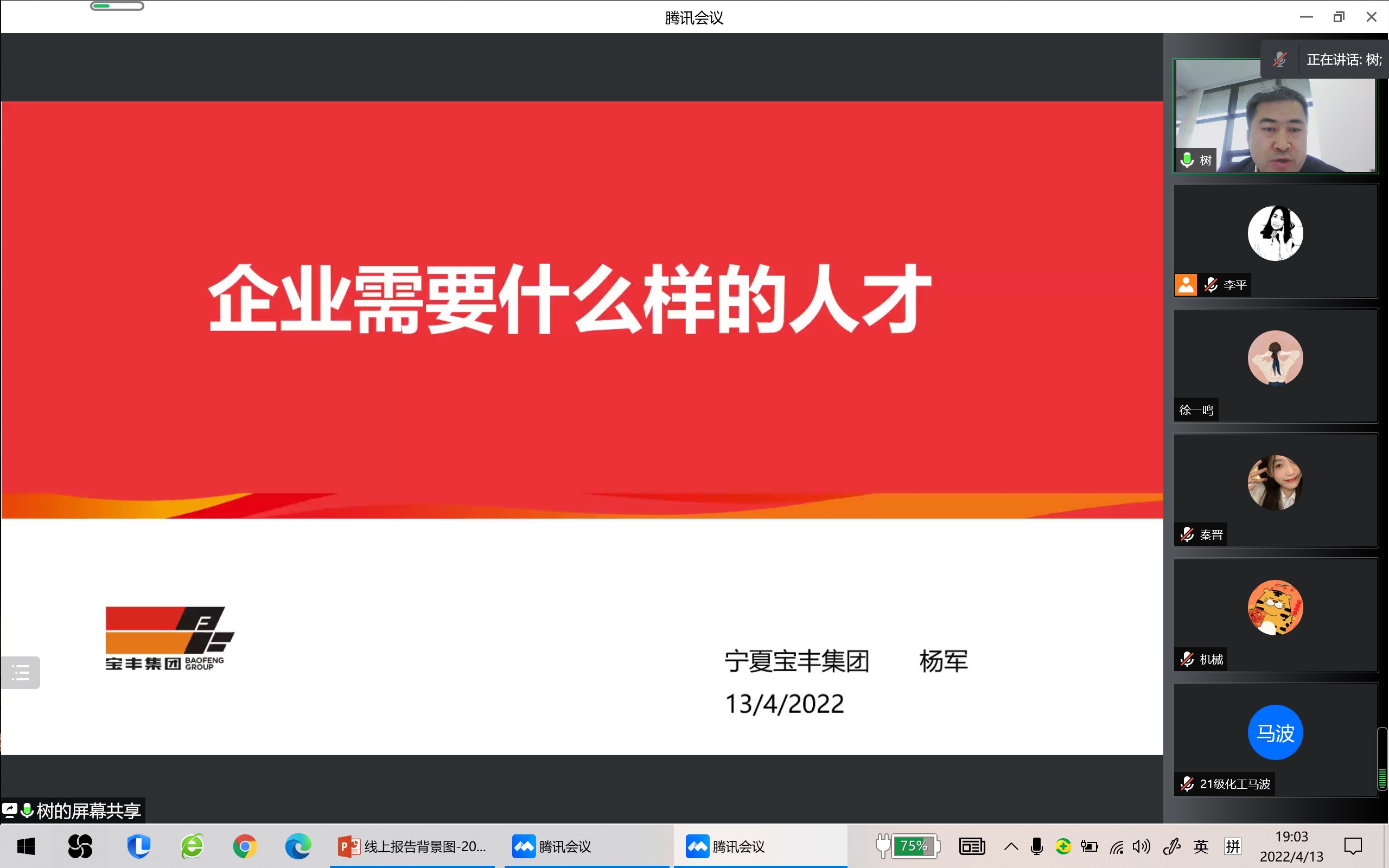杨军副部长从宁夏宝丰集团的产业结构与排列五、人才培养与选拔机制、企业所需化工人才的职业素养、做好大学生职业规划四个方面给同学们做了一场精彩的报告。