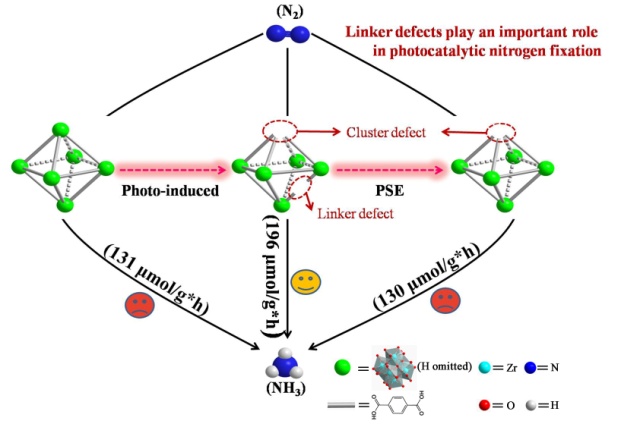 受半导体材料中空位缺陷能有效提升光催化固氮效率启发,我们研究了具有优良热、化学稳定性的UiO-66材料中两种缺陷类型(金属簇缺陷和配体缺陷)对光催化固氮的影响。经过合理而巧妙的实验设计,对比发现配体缺陷会对光催化固氮效率的提升有主要贡献。这是因为配体缺陷形成了金属团簇的不饱和配位环境,能够有效吸附解离NºN键,促进了氮气的活化过程,从而很大程度提升固氮性能。该研究工作首次对MOFs材料缺陷在光催化固氮过程中的影响进行了深入研究,是光催化固氮领域研究的重要发现,对今后进一步拓展固氮光催化剂具有一定的参考价值。