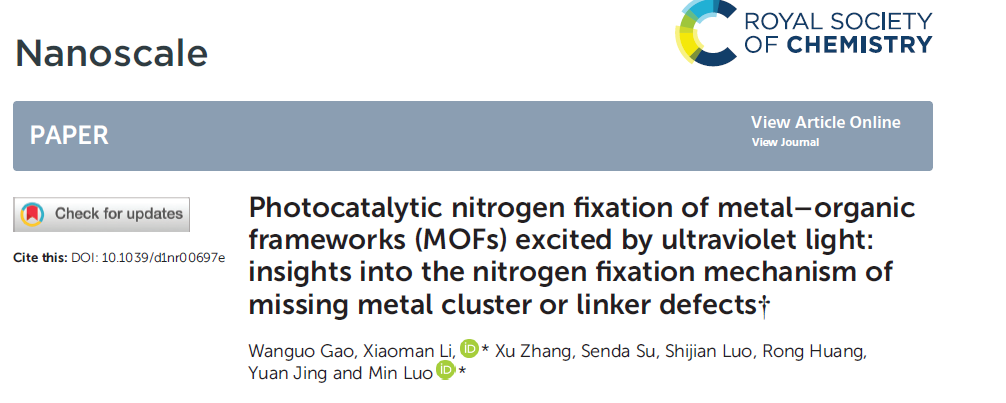 “能源和光电催化材料”课题组在光催化固氮研究方面取得新进展,研究成果在线发表在英国皇家化学学会(Royal Society of Chemistry,简称RSC)著名学术期刊《Nanoscale》(IF: 6.89, 一区TOP)。论文题目:“Photocatalytic nitrogen fixation of metal-organic frameworks (MOFs) excited by ultraviolet light: Insights into the nitrogen fixation mechanism of missing metal cluster or linker defects”;DOI:10.1039/D1NR00697E。