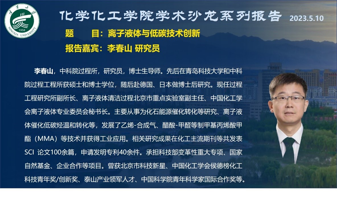 2023年春季第二次学术沙龙报告会在科技楼C219举行。国家“杰出青年”基金获得者、中科院过程所李春山研究员做了题为“离子液体与低碳技术创新”的报告。学院部分青年教师及研究生近50人参加了此次学术活动。报告会由排列五